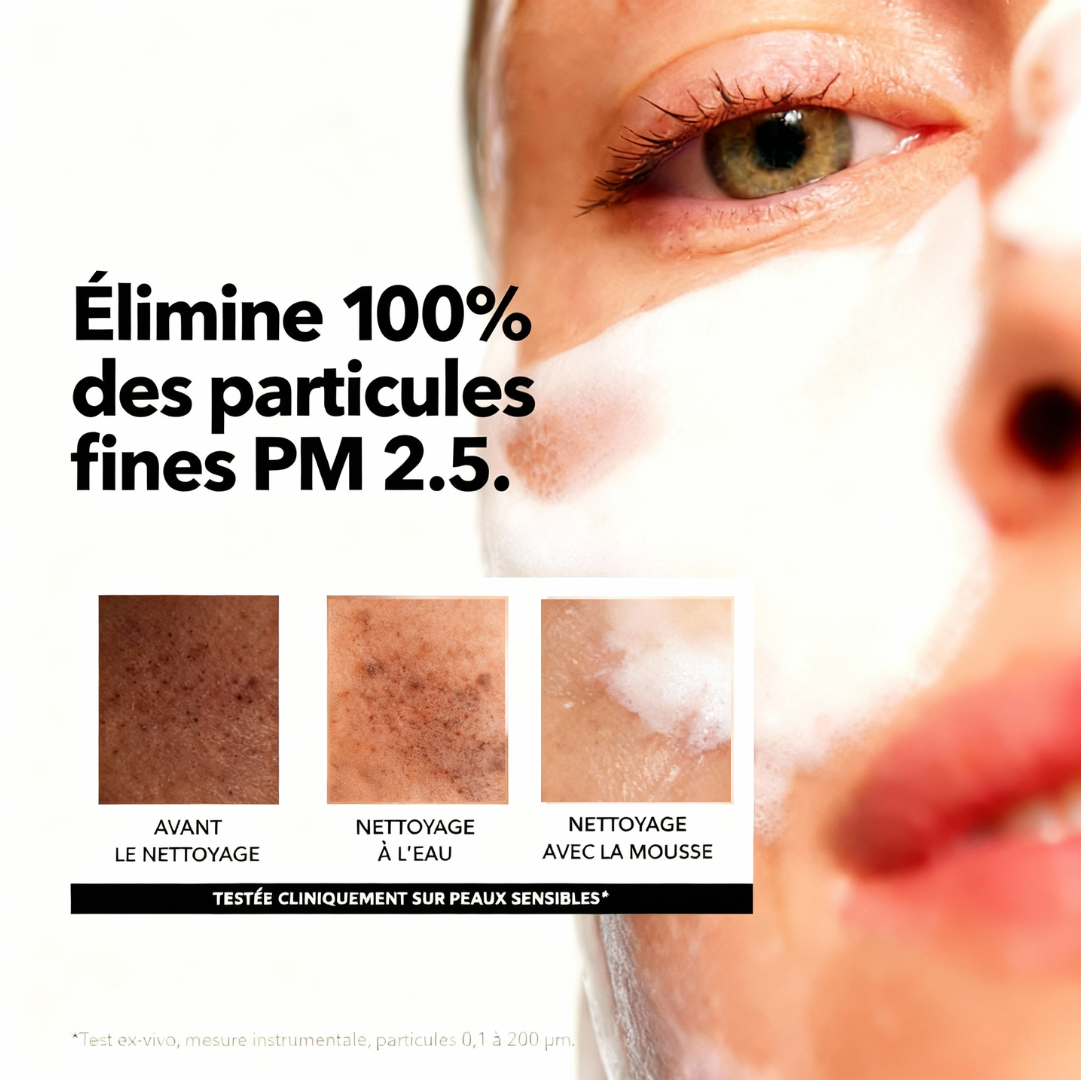 Faites mousser délicatement en massant par mouvements circulaires, en insistant sur la zone T (front, nez, menton) et les joues.